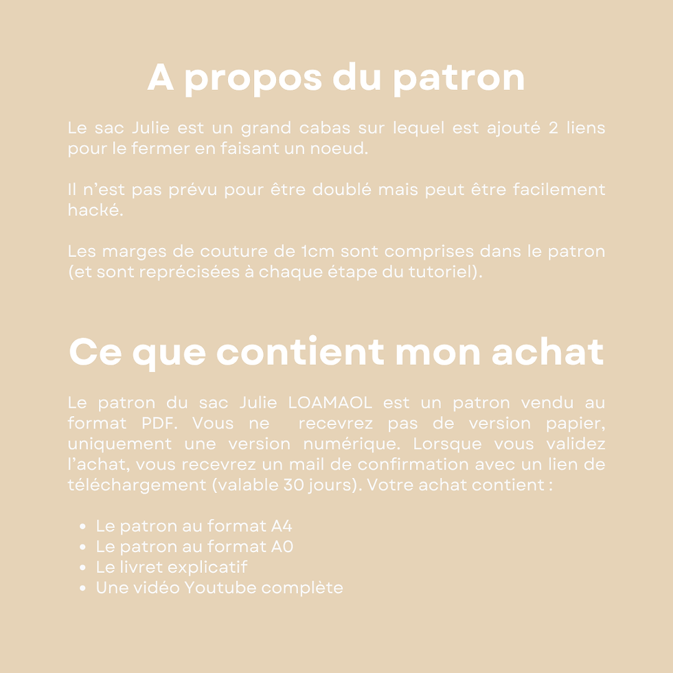 Le sac Julie est un grand cabas sur lequel est ajouté 2 liens pour le fermer en faisant un noeud.